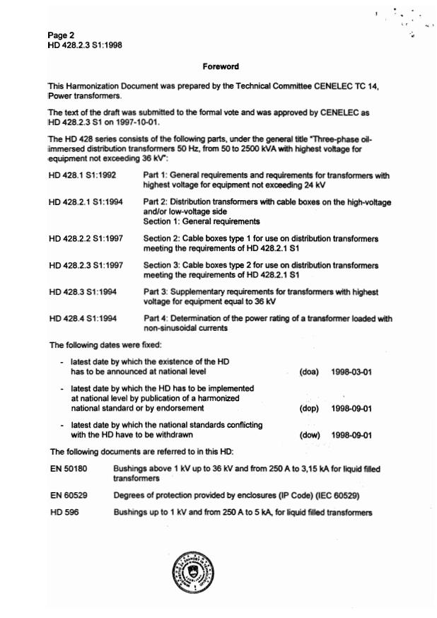 HD 428.2.3 S1:1998 is a standardization document published by CLC. Its full title is "Three-phase oil-immersed distribution transformers 50 Hz, from 50 to 2500 kVA with highest voltage for equipment not exceeding 36 kV - Part 2: Distribution transformers with cable boxes on the high-voltage and/or low-voltage side - Section 3: Cable boxes type 2 for use on distribution transformers meeting the requirements of HD 428.2.1". This standard covers: Superseded by EN 50464-2-3:2007