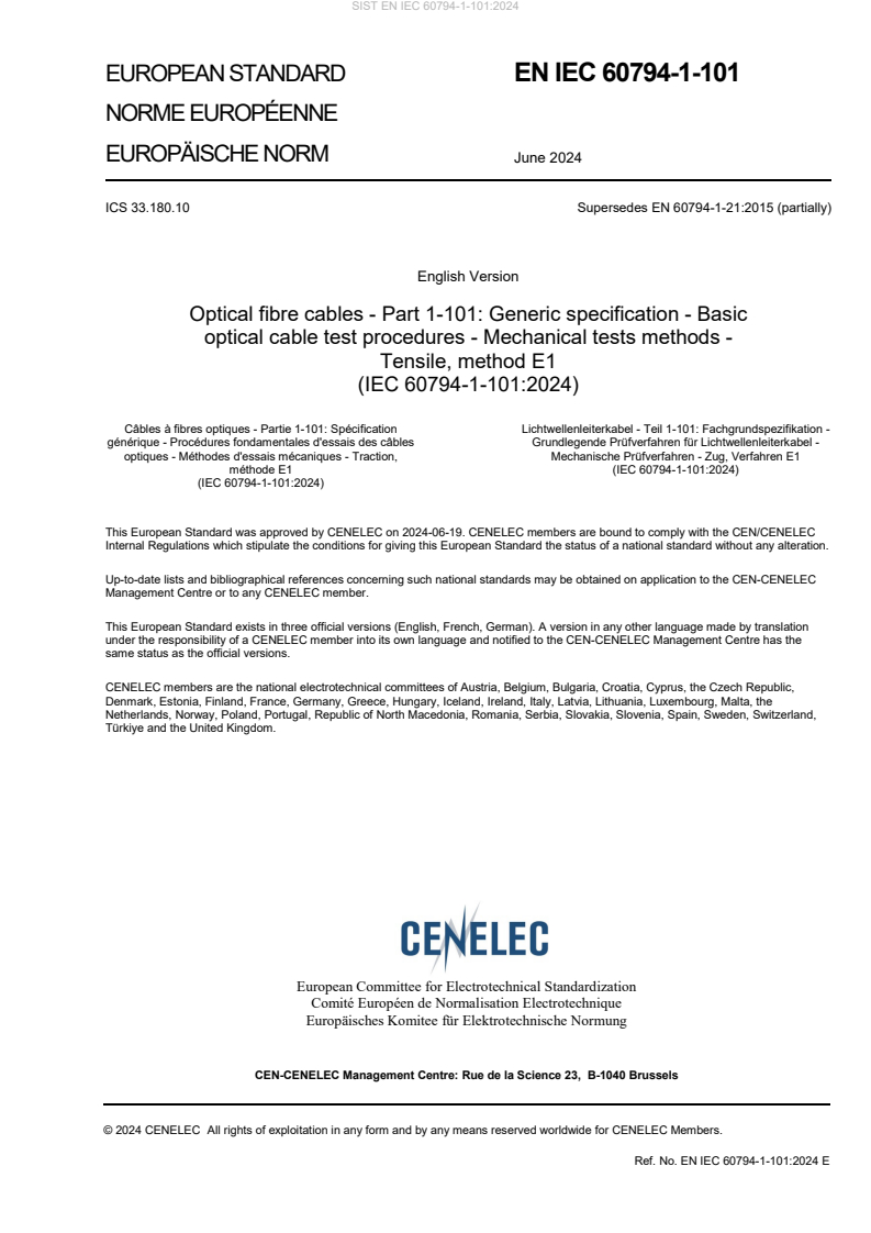The text of the International Standard IEC 60794-1-101:2024 was approved by CENELEC as a