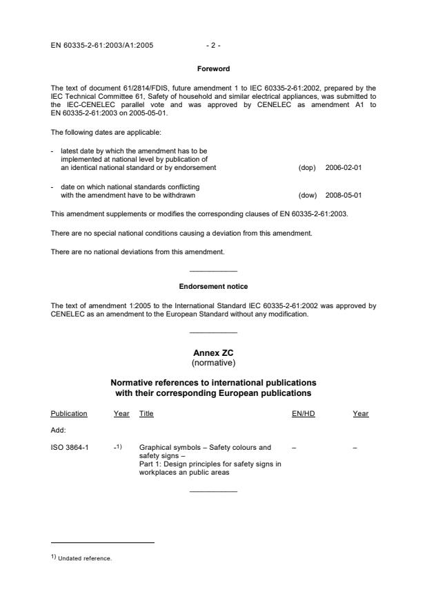 This amendment A1 modifies the European Standard EN 60335-2-61:2003; it was approved by