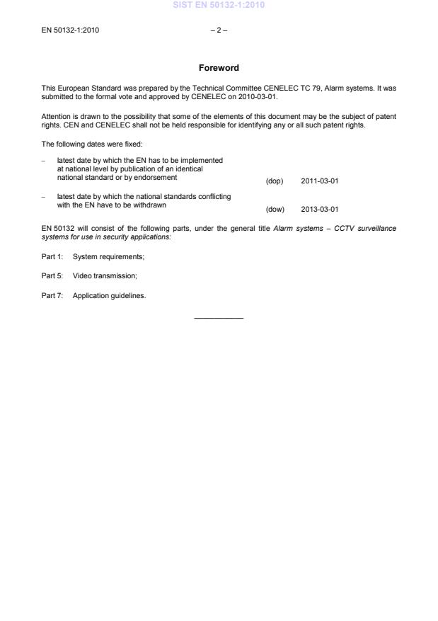 Ta evropski standard določa minimalne zahteve za nadzorne sisteme CCTV, nameščene za aplikacije varovanja. Ta evropski standard določa minimalne zahteve za zmogljivost in funkcionalne zahteve, o katerih se dogovorita stranka in dobavitelj v zahtevi o delovanju, vendar ne vključuje zahtev za zasnovo, načrtovanje, namestitev, preskušanje, postopek ali vzdrževanje (glej Smernice za uporabo v EN 50132-7:1996). Ta evropski standard izključuje namestitev na daljavo nadzorovanih sistemov CCTV, aktiviranih z detektorjem. Ta evropski standard prav tako velja za sisteme CCTV, ki si delijo sredstva zaznavanja, sproženja, medsebojnega povezovanja, nadzora, komunikacije in napajalnike z drugimi aplikacijami. Na delovanje sistema CCTV ne smejo škodljivo vplivati druge aplikacije. Zahteve za komponente CCTV so opredeljene, kjer je klasificirano ustrezno okolje. Ta klasifikacija opisuje okolje, v katerem se za komponente CCTV lahko pričakuje, da bodo delovale tako, kot so zasnovane. Kadar so zahteve štirih okoljskih razredov nazadostne zaradi izrednih pogojev, prisotnih na določenih geografskih lokacijah, lahko veljajo posebni nacionalni pogoji.