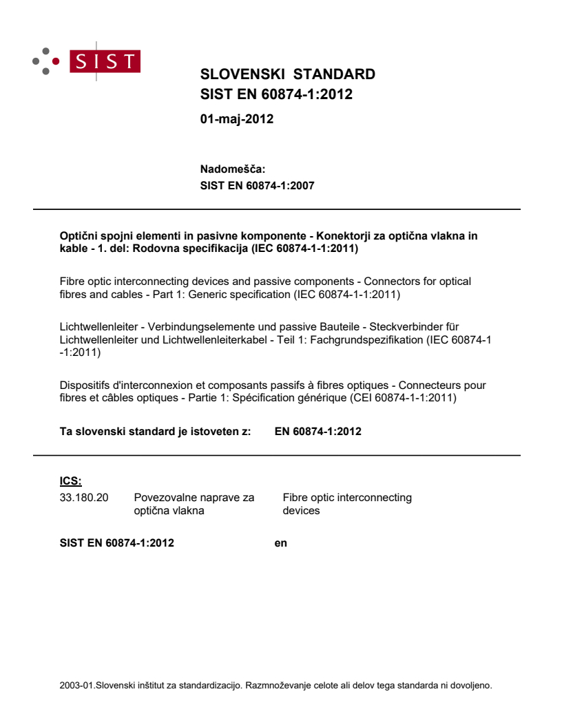 Optični spojni elementi in pasivne komponente - Konektorji za optična vlakna in kable - 1. del: Rodovna specifikacija (IEC 60874-1-1:2011)
