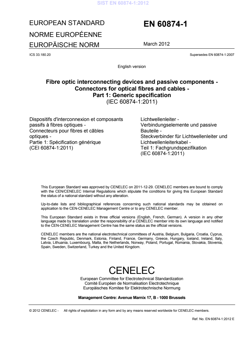 EN 60874-1:2012 is a standard published by CLC. Its full title is "Fibre optic interconnecting devices and passive components - Connectors for optical fibres and cables - Part 1: Generic specification". This standard covers: IEC 60874-1:2011 applies to fibre optic connector sets and individual components (i.e. adaptors, plugs, sockets) for all types, sizes and structures of fibres and cables. It includes: connector set requirements; This part of IEC 60874 is divided into four clauses: - Clauses 1 (Scope), 2 (Normative references) and 3 (Terms and definitions) contain general information pertaining to this generic specification; - Clause 4 (Requirements) contains all the requirements to be met by connectors covered by this specification. This includes requirements for classification, the IEC specification system, documentation, materials, workmanship, quality, performance, identification, and packaging. This sixth edition cancels and replaces the fifth edition published in 2006, and constitutes a technical revision. The specific technical changes from the previous edition include removal of quality assessment procedure, to add the definition of plug-socket configuration, to reconsider a drawing showing the relationship between IEC 60874, IEC 61753, IEC 61754 series of standards., and updating the normative references.