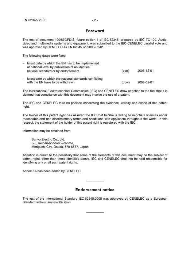 - Normative references and patent notice: references include IEC 60950-1 and ISO/IEC 13346; the document notes a declared patent (Sanyo) that may apply.
