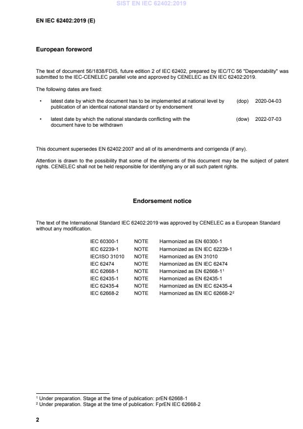 EN IEC 62402 is aligned with and references related standards and guidance such as IEC 60300-1, IEC 62239-1, IEC/ISO 31010, IEC 62474, IEC 62668-1, IEC 62435-1/4 and others that inform dependability, risk assessment and supply‑chain disclosures.