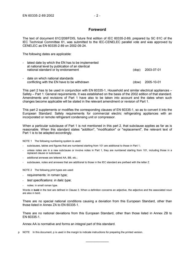 EN 60335-2-89:2002 is a standard published by CLC. Its full title is "Household and similar electrical appliances - Safety - Part 2-89: Particular requirements for commercial refrigerating appliances with an incorporated or remote refrigerant condensing unit or compressor". This standard covers: Deals with the safety of commercial refrigerators with an incorporated compressor, or split systmes supplied in two units for assembly together. Examples are refrigerated display and storage cabinets, service counters, blast chillers. For domestic refrigerators see EN 60335-2-24. For motor compressors, see EN 60335-2-34. For commercial vending machines, see EN 60335-2-75.