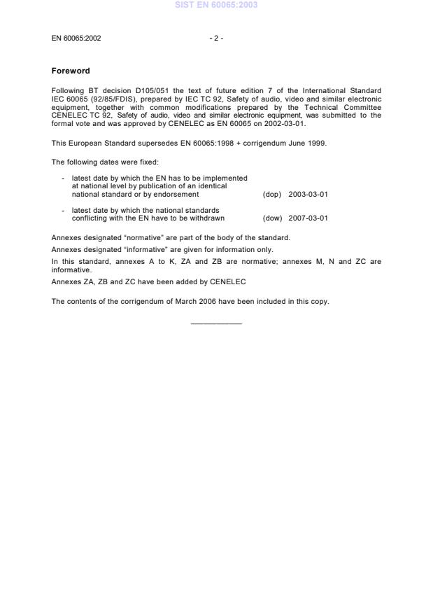 conflicting with the EN have to be withdrawn (dow) 2007-03-01 Annexes designated “normative” are part of the body of the standard. Annexes designated “informative” are given for information only. In this standard, annexes A to K, ZA and ZB are normative; annexes M, N and ZC are informative. Annexes ZA, ZB and ZC have been added by CENELEC The contents of the corrigendum of March 2006 have been included in this copy. ____________ SIST EN 60065:2003