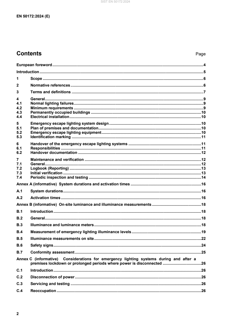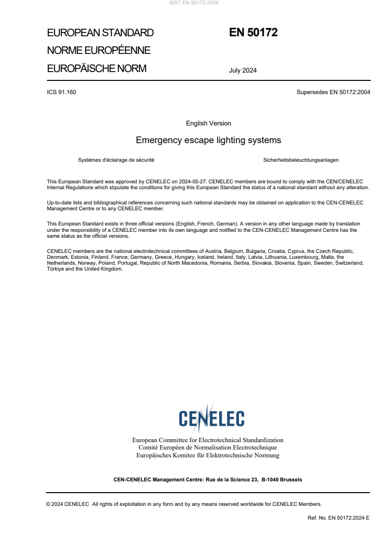 Keywords: EN 50172:2024, emergency escape lighting systems, emergency lighting standard, installation requirements, maintenance and testing, emergency luminaires, escape route lighting.