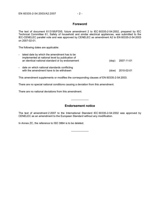 This amendment A2 modifies the European Standard EN 60335-2-54:2003; it was approved by CENELEC