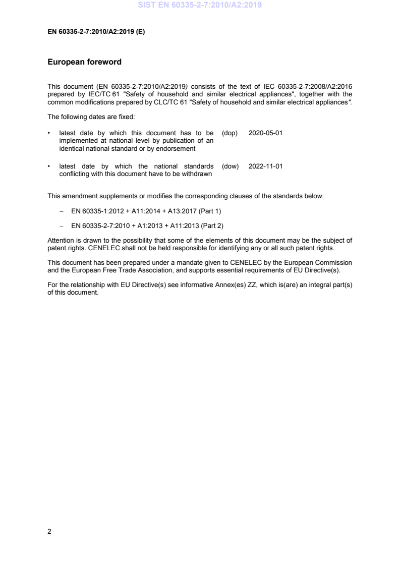 This amendment A2 modifies the European Standard EN 60335-2-7:2010; it was approved by CENELEC on 2019-05-06. CENELEC