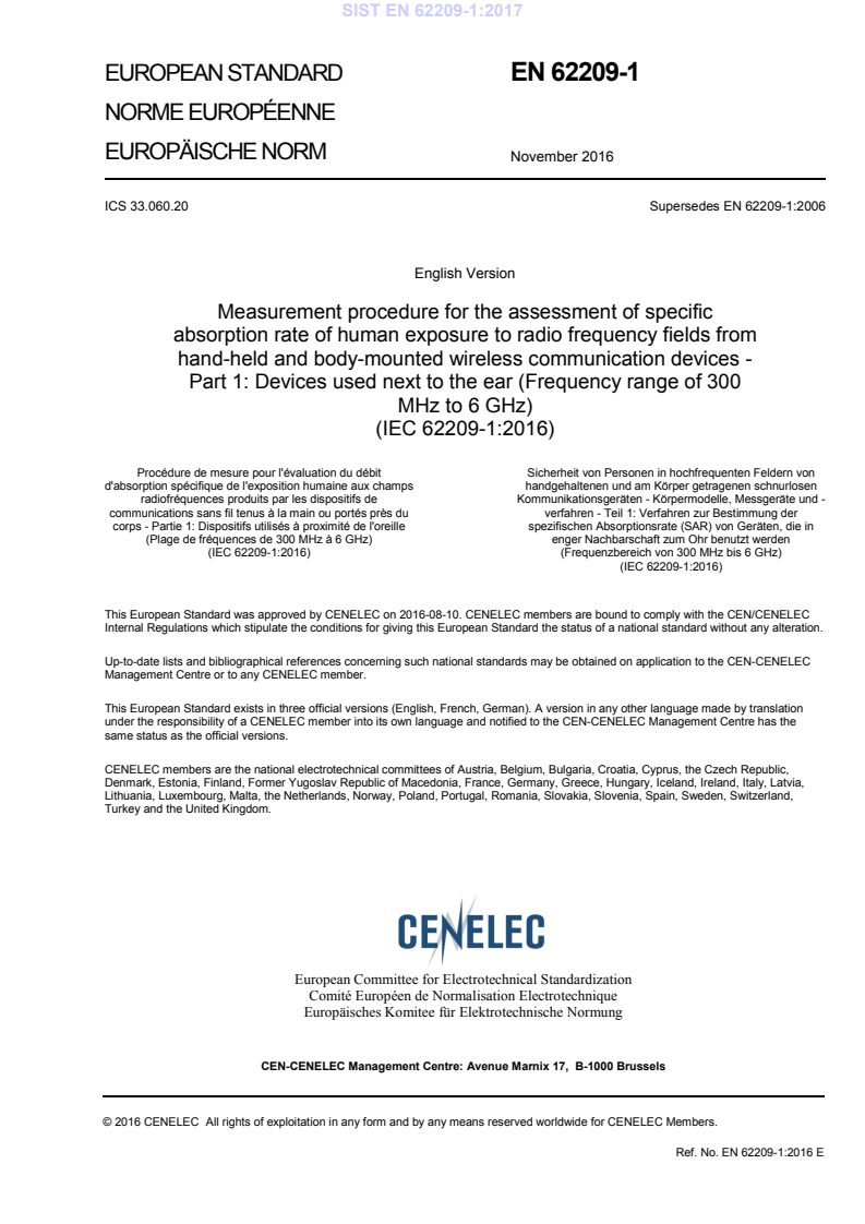 EN 62209-1:2016 is a standard published by CLC. Its full title is "Measurement procedure for the assessment of specific absorption rate of human exposure to radio frequency fields from hand-held and body-mounted wireless communication devices - Part 1: Devices used next to the ear (Frequency range of 300 MHz to 6 GHz)". This standard covers: IEC 62209-1:2016 specifies protocols and test procedures for measurement of the peak spatial-average SAR induced inside a simplified model of the head with defined reproducibility. It applies to certain electromagnetic field (EMF) transmitting devices that are positioned next to the ear, where the radiating structures of the device are in close proximity to the human head, such as mobile phones, cordless phones, certain headsets, etc. These protocols and test procedures provide a conservative estimate with limited uncertainty for the peak-spatial SAR that would occur in the head for a significant majority of people during normal use of these devices. The applicable frequency range is from 300 MHz to 6 GHz. This second edition cancels and replaces the first edition published in 2005. This edition constitutes a technical revision.