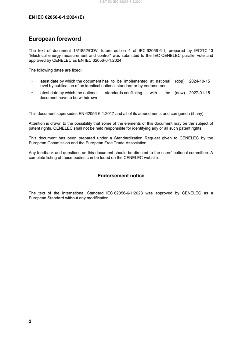 - EN IEC 62056-6-1:2024 supersedes EN 62056-6-1:2017 and is endorsed by CENELEC for national adoption.