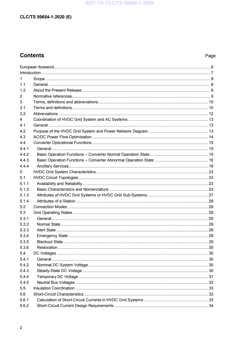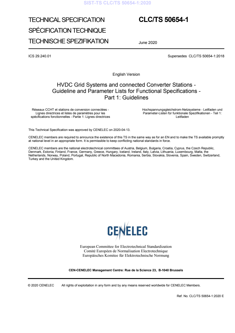 CLC/TS 50654-1:2020 is a technical specification published by CLC. Its full title is "HVDC Grid Systems and connected Converter Stations - Guideline and Parameter Lists for Functional Specifications - Part 1: Guidelines". This standard covers: 1.1 General These Guidelines and Parameter Lists to Functional Specifications describe specific functional requirements for HVDC Grid Systems. The terminology "HVDC Grid Systems" is used here describing HVDC systems for power transmission having more than two converter stations connected to a common DC circuit. While this document focuses on requirements, that are specific for HVDC Grid Systems, some requirements are considered applicable to all HVDC systems in general, i.e. including point-to-point HVDC systems. Existing IEC, Cigré or other documents relevant have been used for reference as far as possible. Corresponding to electric power transmission applications, this document is applicable to high voltage systems, i.e. having typically nominal DC voltages higher than 50 kV with respect to earth are considered in this document. NOTE: While the physical principles of DC networks are basically voltage independent, the technical options for designing equipment get much wider with lower DC voltage levels, e.g. in case of converters or switchgear. Both parts have the same outline and headlines to aid the reader. 1.2 About the Present Release The present release of the Guidelines and Parameter Lists for Functional Specifications describes technical guidelines and specifications for HVDC Grid Systems which are characterized by having exactly one single connection between two converter stations, often referred to as radial systems. When developing the requirements for radial systems, care is taken not to build up potential showstoppers for meshed systems. Meshed HVDC Grid Systems can be included into this specification at a later point in time. The Guidelines and Parameter List to the Functional Specification of HVDC Grid Systems cover technical aspects of: - coordination of HVDC grid and AC systems - HVDC Grid System characteristics - HVDC Grid System control - HVDC Grid System protection - AC/DC converter stations - HVDC Grid System installations, including DC switching stations - models and validation - HVDC Grid System integration tests Beyond the present scope, the following content is proposed for future work: - transmission lines and transition stations - DC/DC converter stations - DC line power flow controllers
