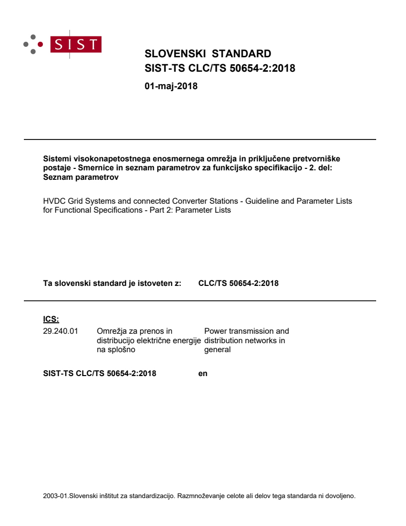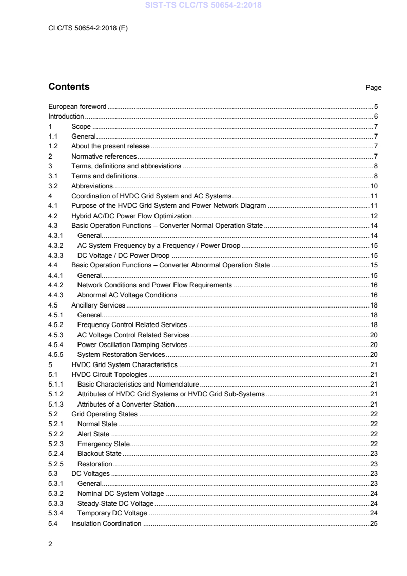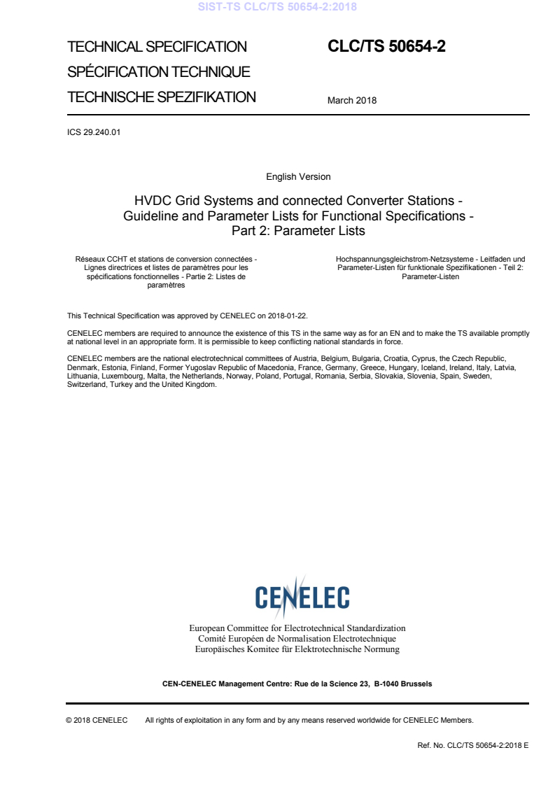 CLC/TS 50654-2:2018 is a technical specification published by CLC. Its full title is "HVDC Grid Systems and connected Converter Stations - Guideline and Parameter Lists for Functional Specifications - Part 2: Parameter Lists". This standard covers: 1.1 General These Guidelines and Parameter Lists to Functional Specifications describe specific functional requirements for HVDC Grid Systems. The terminology "HVDC Grid Systems" is used here describing HVDC systems for power transmission having more than two converter stations connected to a common d.c. circuit. While this document focuses on requirements, that are specific for HVDC Grid Systems, some requirements are considered applicable to all HVDC systems in general, i.e. including point-to-point HVDC systems. Existing IEC, Cigré or other documents relevant have been used for reference as far as possible. Corresponding to electric power transmission applications, this document is applicable to high voltage systems, i.e. .only nominal d.c. voltages equal or higher than 50 kV with respect to earth are considered in this document. NOTE While the physical principles of d.c. networks are basically voltage independent, the technical options for designing equipment get much wider with lower d.c. voltage levels, e.g. in case of converters or switchgear. Both parts have the same outline and headlines to aid the reader. 1.2 About the present release The present release of the Guidelines and Parameter Lists for Functional Specifications describes technical guidelines and specifications for HVDC Grid Systems which are characterized by having exactly one single connection between two converter stations, often referred to as radial systems. When developing the requirements for radial systems, care is taken not to build up potential show-stoppers for meshed systems. Meshed HVDC Grid Systems can be included into this specification at a later point in time. The Guidelines and Parameter List to the Functional Specification of HVDC Grid Systems cover technical aspects of - Coordination of HVDC Grid and a.c. Systems - HVDC Grid System Characteristics - HVDC Grid System Control - HVDC Grid System Protection - Models and Validation - Beyond the present scope, the following aspects are proposed for future work: - AC/DC converter stations - HVDC Grid System Equipment - HVDC Grid System Integration Tests