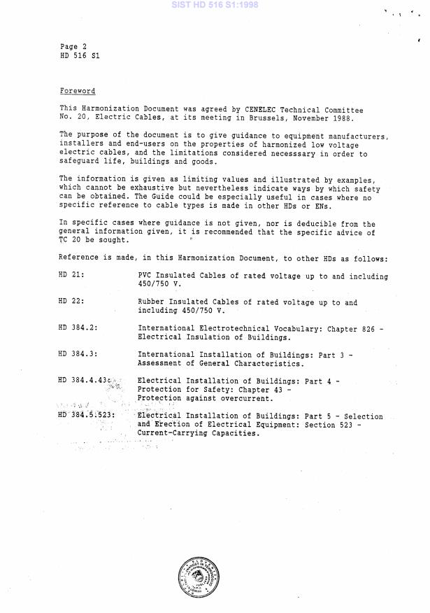 HD 516 S1:1990 is a standardization document published by CLC. Its full title is "Guide to use of low-voltage harmonised cables". This standard covers: This HD provides a guide to the proposed safe use of harmonised electric cables as presently covered in the various parts of: HD 21 - PVC Insulated Cables of rated voltage up to and including 450/750 V. HD 22 - Rubber Insulated Cables of rated voltage up to and including 450/750 V. Cables should only be used within the limits given and in the manner described in this HD and in HD 21 and HD 22. This HD should be read in conjunction with other HD's or EN's relating to particular types of equipment or installation conditions. Legal or statutory requirements do take precedence over the guidance given in this document. Note: Guidance given in HD 21 and HD 22, is still relevant and will be incorporated in this HD at the next revision.