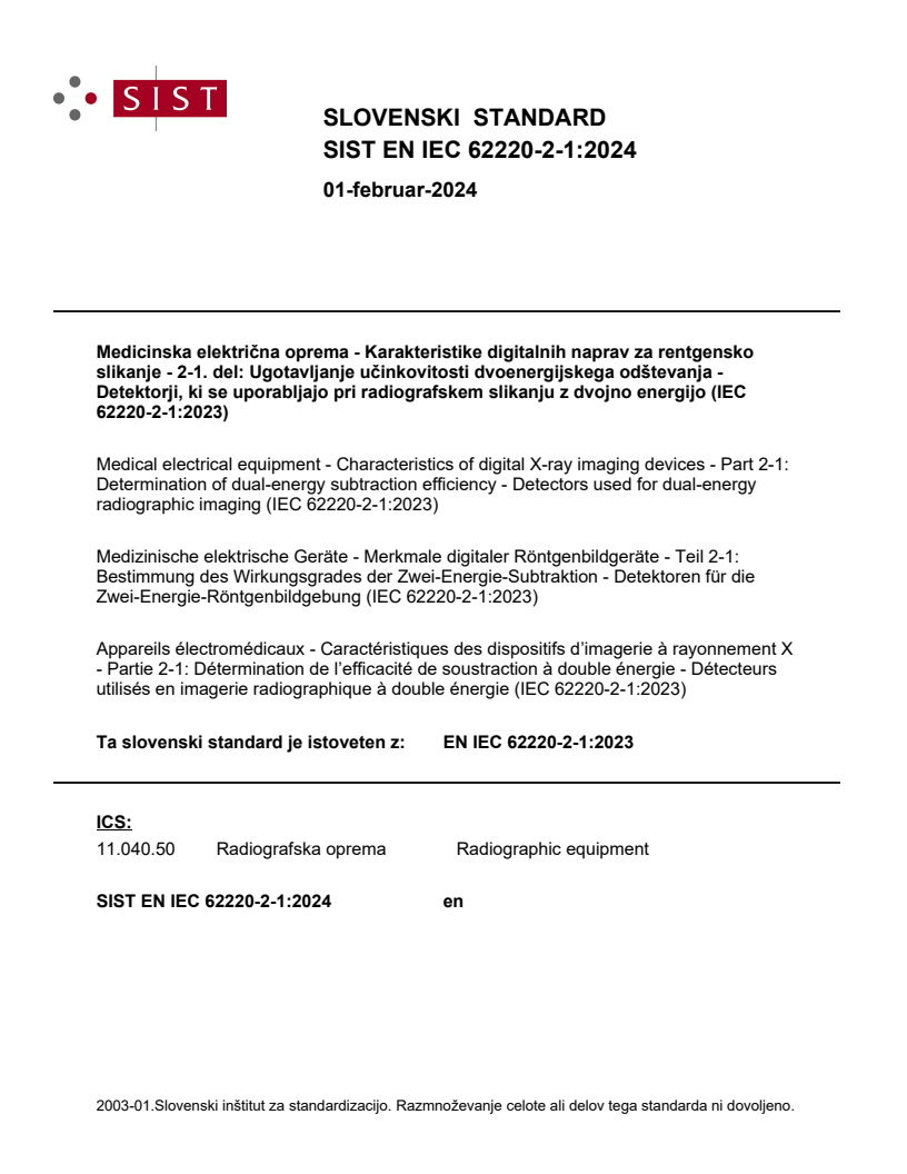 Standard IEC 62220-2-1:2023 opisuje meritev zmogljivosti v zvezi z RADIOGRAFSKIM SLIKANJEM Z DVOJNO ENERGIJO z DIGITALNIMI NAPRAVAMI ZA RENTGENSKO SLIKANJE, ki so namenjene medicinski uporabi, in podaja metode za njihovo določanje. To meritev je mogoče uporabiti za analiziranje SLIK ODŠTETEGA TKIVA in ocenjevanje učinkov pri odmerjanju, značilnosti hrupa in učinkovitosti odštevanja tkiva DIGITALNIH NAPRAV ZA RENTGENSKO SLIKANJE. Opisane metode navajajo postopke za pridobivanje MULTISPEKTRALNIH PRIMARNIH PODATKOV in računanje njihovih izpeljanih SLIK ODŠTETEGA TKIVA.