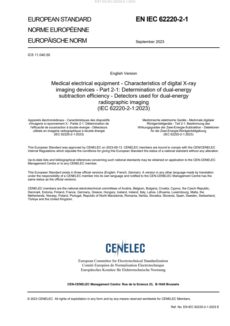 EN IEC 62220-2-1:2023 is a standard published by CLC. Its full title is "Medical electrical equipment - Characteristics of digital X-ray imaging devices - Part 2-1: Determination of dual-energy subtraction efficiency - Detectors used for dual-energy radiographic imaging". This standard covers: IEC 62220-2-1:2023 describes the performance metrics associated with DUAL-ENERGY IMAGING capable DIGITAL X-RAY IMAGING DEVICES meant for medical applications and specifies the methods for their determination. These metrics can be used to analyse TISSUE-SUBTRACTED IMAGES and to evaluate dose performance, noise characteristics, and tissue-subtraction efficacy of DIGITAL X-RAY IMAGING DEVICES. The described methods indicate the procedures to obtain MULTI-SPECTRAL PRIMARY DATA and to compute their derived TISSUE-SUBTRACTED IMAGES. The intended users of this document are MANUFACTURERS and well-equipped test laboratories. This document is restricted to DIGITAL X-RAY IMAGING DEVICES that are used for single or multiple exposure dual-energy radiographic imaging based on, for example, CR systems, direct and indirect flat panel-detector based systems. This document excludes and is not applicable to: – DIGITAL X-RAY IMAGING DEVICES intended to be used in mammography or in dental RADIOGRAPHY; – slot scanning DIGITAL X-RAY IMAGING DEVICES; – COMPUTED TOMOGRAPHY or CONE-BEAM COMPUTED TOMOGRAPHY; – photon-energy discriminating devices such as photon counting X-RAY IMAGING DEVICES; – devices for dynamic imaging (where series of images are acquired, as in fluoroscopy or cardiac imaging). – DIGITAL X-RAY IMAGING DEVICES intended to be used with RADIOTHERAPY beams.