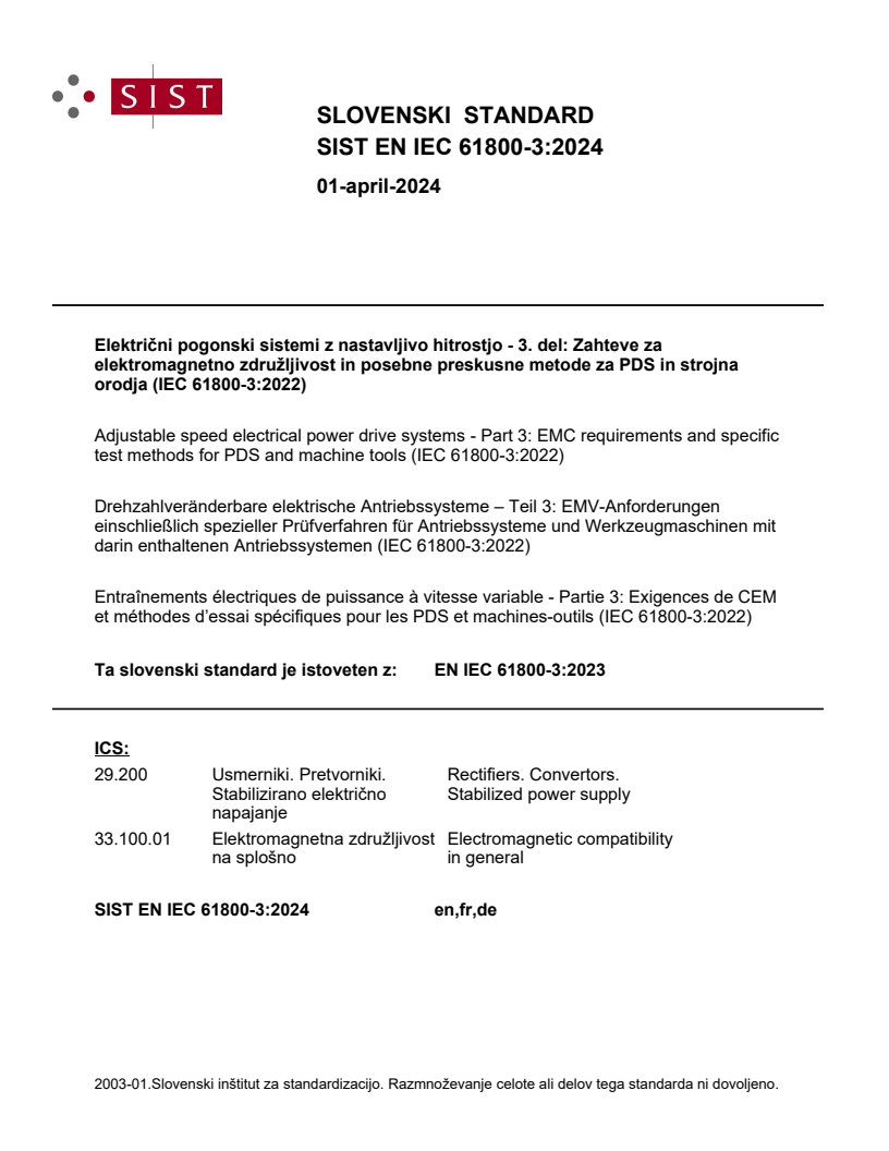 Standard IEC 61800-3:2022 določa zahteve elektromagnetne združljivosti za električne pogonske sisteme z nastavljivo hitrostjo (PDS) in strojna orodja (MT). Električni pogonski sistem z nastavljivo hitrostjo je motorni pogon na izmenični ali enosmerni tok, vključno z elektronskim pretvornikom. Zahteve so navedene za električne pogonske sisteme z nastavljivo hitrostjo na izmenični ali enosmerni tok in strojna orodja z vhodnimi in/ali izhodnimi (medlinijskimi) napetostmi pretvornika do 35 kV efektivne vrednosti izmenične napetosti. Ta dokument se ne uporablja za opremo vseh nazivnih moči.