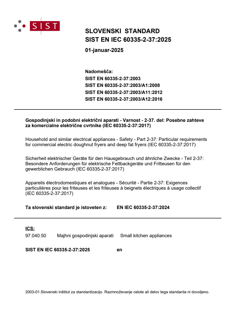 - IEC 60335‑1 (Mandatory: general requirements - EN IEC 60335‑2‑37 is to be used in conjunction with the latest IEC 60335‑1 edition)