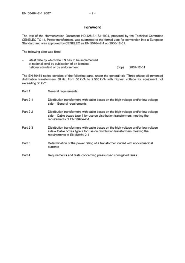 EN 50464-2-1:2007 is a standard published by CLC. Its full title is "Three-phase oil-immersed distribution transformers 50 Hz, from 50 kVA to 2 500 kVA with highest voltage for equipment not exceeding 36 kV - Part 2-1: Distribution transformers with cable boxes on the high-voltage and/or low-voltage side - General requirements". This standard covers: EN 50464-2-1 covers, in conjunction with EN 50464-1, distribution transformers under iii) and iv) above, up to 36 kV (the data from 24 kV to 36 kV are under consideration). Further documents exist which may be used by agreement between purchaser and manufacturer for cable boxes and enclosures. The dimensional requirements for cable boxes and protective enclosures are not enclosed in this document.
