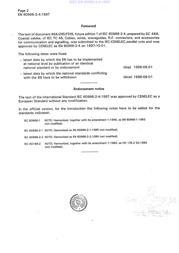 EN 60966-2-4:1997 is a standard published by CLC. Its full title is "Radio frequency and coaxial cable assemblies - Part 2-4: Detail specification for cable assemblies for radio and TV receivers (Frequency range 0 to 3 000 MHz, IEC 60169-2 connectors)". This standard covers: Relates to cable assemblies for audio and TV receivers, and in particular to the cable subfamily 9.52.