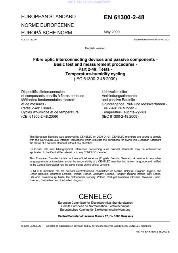 – 2 – Foreword The text of document 86B/2807/FDIS, future edition 2 of IEC 61300-2-48, prepared by SC 86B, Fibre optic interconnecting devices and passive components, of IEC TC 86, Fibre optics, was submitted to the IEC-CENELEC parallel vote and was approved by CENELEC as EN 61300-2-48 on 2009-04-01. This European Standard supersedes EN 61300-2-48:2003. The main changes are the addition of the Category O cycle procedure and the severity reconsideration. The following dates were fixed: – latest date by which the EN has to be implemented