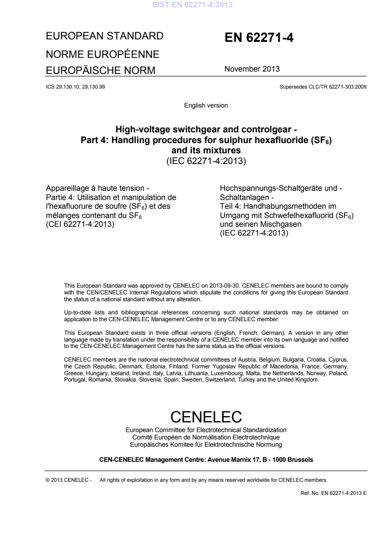 EN 62271-4:2013 is a standard published by CLC. Its full title is "High-voltage switchgear and controlgear - Part 4: Handling procedures for sulphur hexafluoride (SF6) and its mixtures". This standard covers: IEC 62271-4:2013 applies to the procedures for handling of SF6 during installation, commissioning, normal and abnormal operations, disposal at the end of life of high voltage switchgear and controlgear. This first edition cancels and replaces the first edition of IEC/TR 62271-303 published in 2008. This first edition constitutes a technical revision. This edition includes the following significant technical changes with respect to the previous edition: a) the description of the potential effects on health of SF6 by products (former Annex D of IEC/TR 62271-303:2008) has been replaced by the calculation methods for evaluating of the potential effects on health of SF6 by products (see Annex H); b) information about cryogenic reclaim of SF6. Have been added (see Annex I); c) handling procedures for the most popular SF6 mixtures have been added (see Annex J).