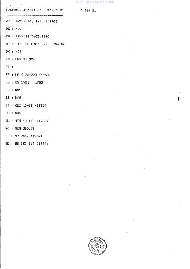 HD 214 S2:1980 has the following relationships with other standards: It is inter standard links to EN 60112:2003, EN 61131-2:1994, EN 60215:1989, EN 62019:1999/A1:2003, EN 62094-1:2003, EN 60598-1:1993/A1:1996, EN 60079-7:2003, EN 60926:1990/A2:1994, EN 60335-1:1994, EN 60730-1:2000, EN 60309-1:1997, EN 60238:1998, HD 307.2.2 S1:1986, EN 60926:1996, EN 60439-1:1999. Understanding these relationships helps ensure you are using the most current and applicable version of the standard.