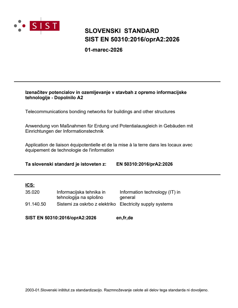 Ta slovenski standard je istoveten z: EN 50310:2016/prA2:2026