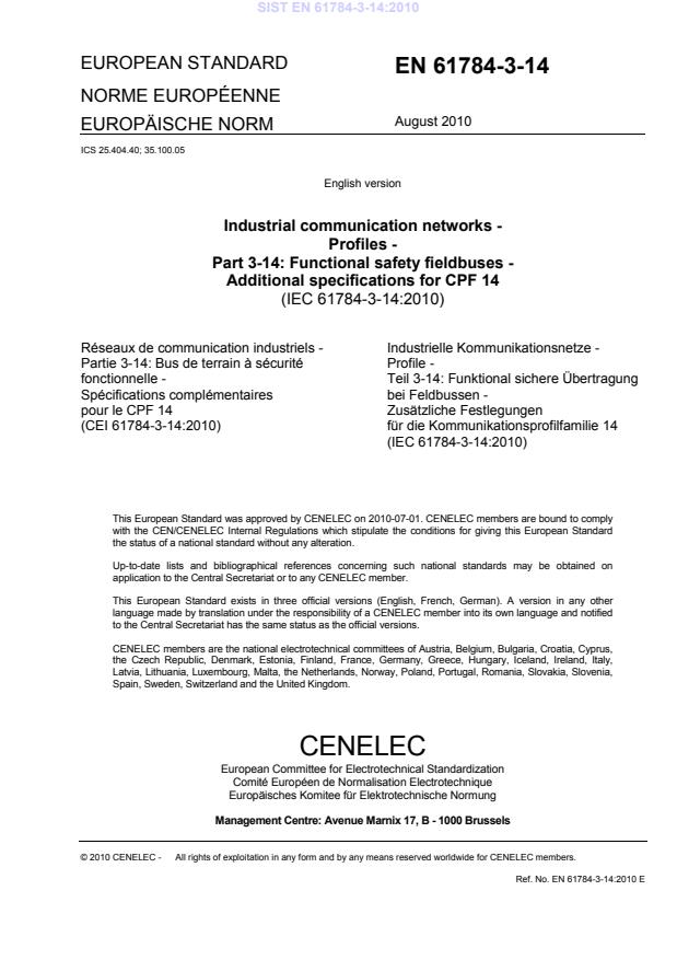 EN 61784-3-14:2010 (equivalent to IEC 61784-3-14:2010) specifies a safety communication layer - services and protocol - for functional safety over fieldbuses based on CPF 14 (IEC 61784-2) and IEC 61158 Type 14. The standard identifies and applies the functional safety communication principles of IEC 61784-3 specifically to CPF 14, defining object extensions, message formats and management functions required to support certified safety communication in industrial communication networks.