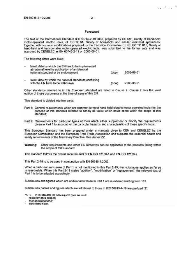 EN 60745-2-19:2005 is associated with the following European legislation: EU Directives/Regulations: 98/37/EC. When a standard is cited in the Official Journal of the European Union, products manufactured in conformity with it benefit from a presumption of conformity with the essential requirements of the corresponding EU directive or regulation.