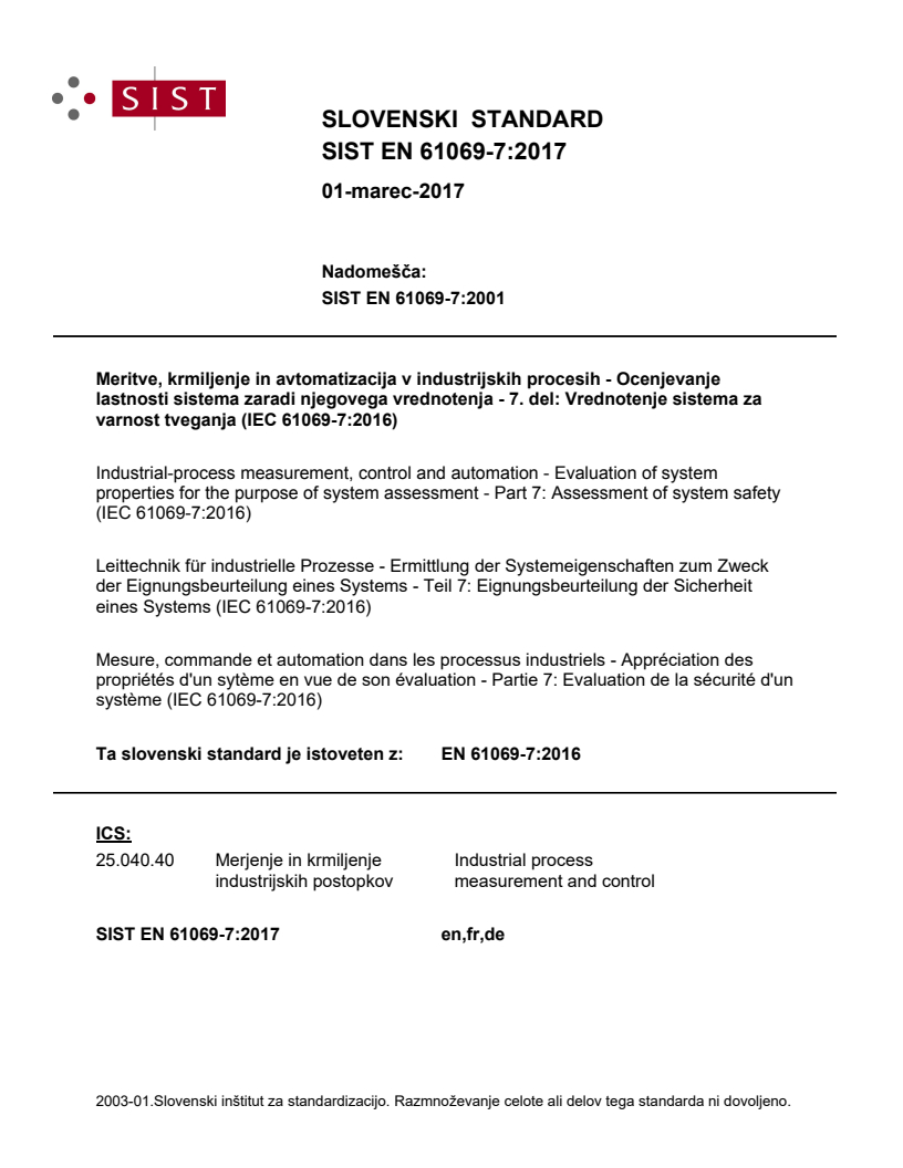 EN 61069-7:2016 (IEC 61069-7:2016) is the European adoption of the international standard for the assessment of system safety within industrial-process measurement, control and automation systems. It defines how to evaluate safety-related properties intrinsic to the control system itself (not hazards introduced by the process or controlled equipment). This edition (2016) is a technical revision that replaces the 1999 edition and is part of the IEC 61069 series on evaluation of system properties.