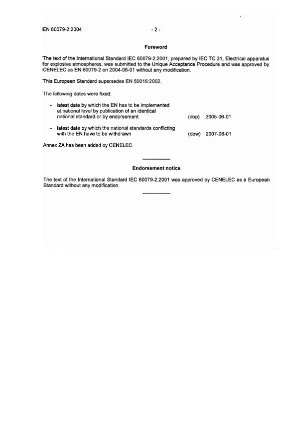 SC to prepare amendment to cover the essential requirements of ATEX directive (formal vote) * Supersedes EN 50016:2002 * Corrigendum to EN issued April 2006 * Superseded by EN 60079-2:2007