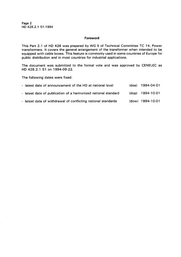 HD 428.2.1 S1:1994 is a standardization document published by CLC. Its full title is "Three phase oil-immersed distribution transformers 50 Hz, from 50 kVA to 2,5 MVA with highest voltage for equipment not exceeding 36 kV - Part 2: Distribution transformers with cable boxes on the high-voltage and/or low-voltage side - Section 1: General requirements". This standard covers: Superseded by EN 50464-2-1:2007