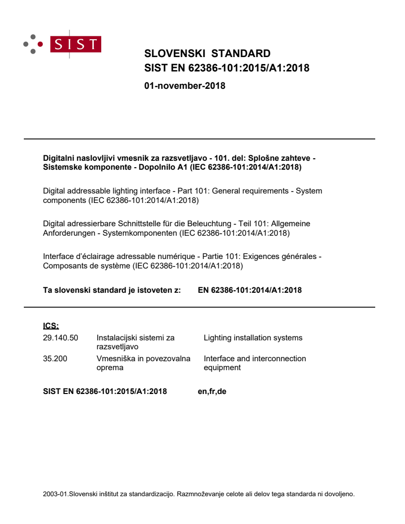 Ta slovenski standard je istoveten z: EN 62386-101:2014/A1:2018