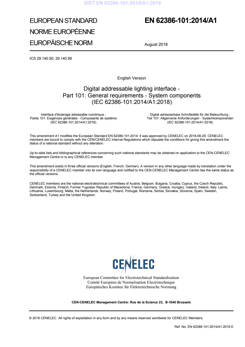 EN 62386-101:2014/A1:2018 is the CLC/CENELEC adoption of IEC 62386-101:2014 Amendment 1 for the Digital Addressable Lighting Interface (DALI) - Part 101: General requirements for system components. Published August–November 2018, this amendment (version 2.01) updates system-level requirements for DALI system components, adds explicit support for DC supplies, and clarifies timing, electrical and operational behaviour for bus-powered and externally powered devices.