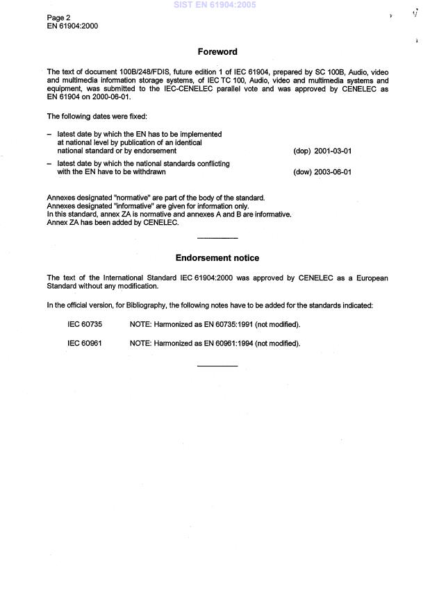 EN 61904 is published in alignment with IEC standardization practices (IEC 61904:2000). It sits in the broader set of standards for video systems (ICS 33.160.40) and is typically considered alongside other media‑ and signal‑format standards used in professional video and archival contexts.