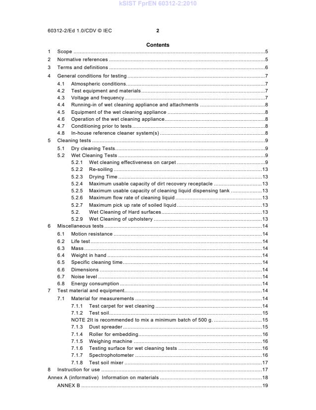 2Contents 1 Scope.5 2 Normative references.5 3 Terms and definitions.6 4 General conditions for testing.7 4.1 Atmospheric conditions.7 4.2 Test equipment and materials.7 4.3 Voltage and frequency.7 4.4 Running-in of wet cleaning appliance and attachments.8 4.5 Equipment of the wet cleaning appliance.8 4.6 Operation of the wet cleaning appliance.8 4.7 Conditioning prior to tests.8 4.8 In-house reference cleaner system(s).8 5 Cleaning tests.9 5.1 Dry cleaning Tests.9 5.2 Wet Cleaning Tests.9 5.2.1 Wet cleaning effectiveness on carpet.9 5.2.2 Re-soiling.13 5.2.3 Drying Time.13 5.2.4 Maximum usable capacity of dirt recovery receptacle.13 5.2.5 Maximum usable capacity of cleaning liquid dispensing tank.13 5.2.6 Maximum flow rate of cleaning liquid.13 5.2.7 Maximum pick up rate of soiled liquid.13 5.2. Wet Cleaning of Hard surfaces.13 5.2.9 Wet Cleaning of upholstery.13 6 Miscellaneous tests.14 6.1 Motion resistance.14 6.2 Life test.14 6.3 Mass.14 6.4 Weight in hand.14 6.5 Specific cleaning time.14 6.6 Dimensions.14 6.7 Noise level.14 6.8 Energy consumption.14 7 Test material and equipment.14 7.1 Material for measurements.14 7.1.1 Test carpet for wet cleaning.14 7.1.2 Test soil.15 NOTE 2It is recommended to mix a minimum batch of 500 g.15 7.1.3 Dust spreader.15 7.1.4 Roller for embedding.16 7.1.5 Weighing machine.16 7.1.6 Testing surface for wet cleaning tests.16 7.1.7 Spectrophotometer.16 7.1.8 Test soil mixer.17 8 Instruction for use.17 Annex A (informative)