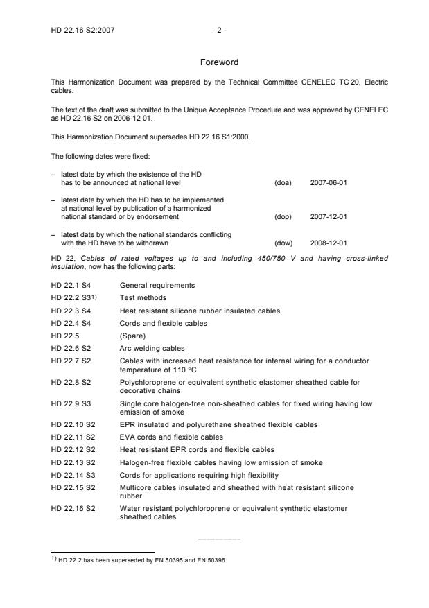HD 22.16 S2:2007 has the following relationships with other standards: It is inter standard links to HD 22.16 S1:2000, EN 50525-2-21:2011. Understanding these relationships helps ensure you are using the most current and applicable version of the standard.