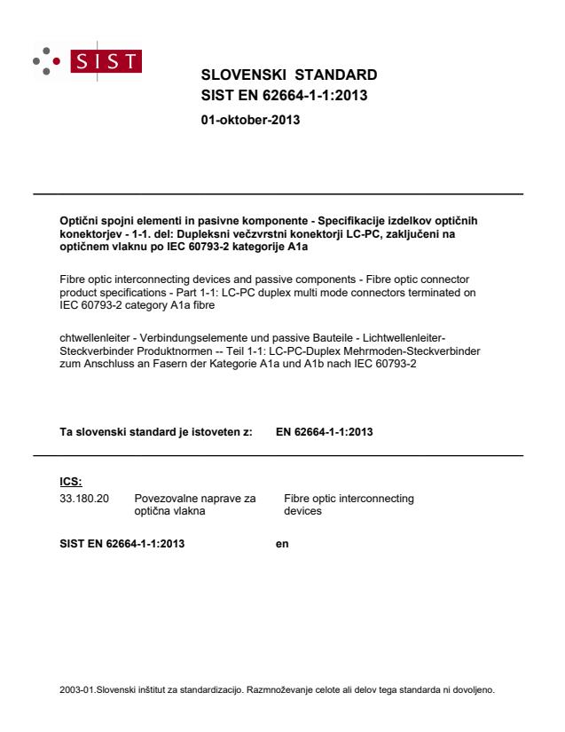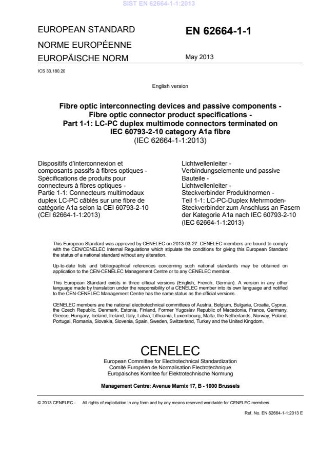 EN 62664-1-1:2013 (IEC 62664-1-1:2013) specifies start-of-life dimensional, optical, mechanical and environmental performance requirements for a terminated and assembled multimode resilient alignment sleeve LC‑PC duplex connector set (plug/adaptor/plug). It applies to LC‑PC duplex multimode connectors terminated on IEC 60793-2-10 category A1a fibre and defines the requirements that a product must meet to be classified as an International Standard connector product.