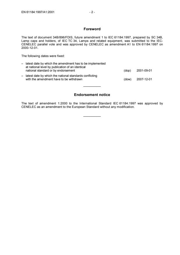 EN 61184:1997/A1:2001 is a amendment published by CLC. Its full title is "Bayonet lampholders". This standard covers: EN following parallel vote * Superseded by EN 61184:2008