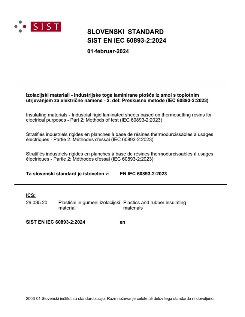 Keywords: EN IEC 60893-2:2023, insulating materials, industrial rigid laminated sheets, thermosetting resins, methods of test, dielectric strength, permittivity, mechanical tests, thermal endurance.