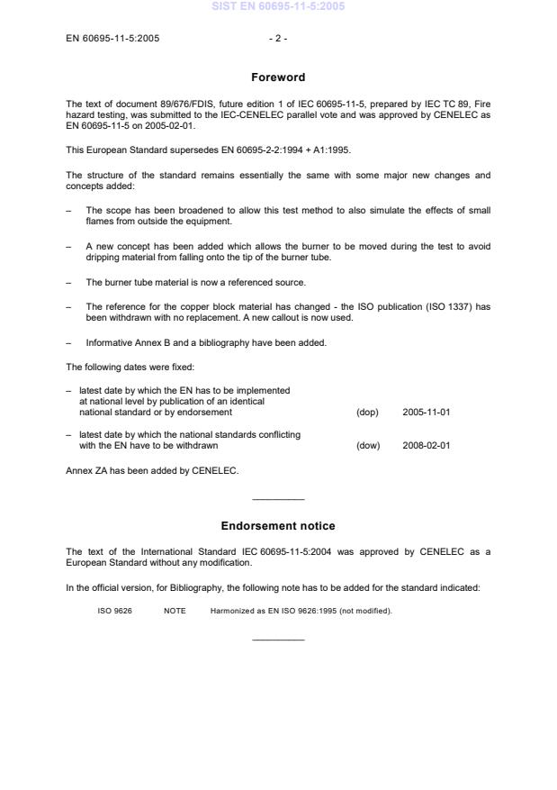 2008-02-01 Annex ZA has been added by CENELEC. __________ Endorsement notice The text of the International Standard IEC 60695-11-5:2004 was approved by CENELEC as a European Standard without any modification. In the official version, for Bibliography, the following note has to be added for the standard indicated: ISO 9626 NOTE Harmonized as EN ISO 9626:1995 (not modified). __________