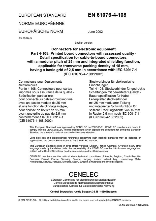 EN 61076-4-108:2002 (CLC) is a European adoption of IEC 61076-4-108:2002 that defines a detail specification for cable-to-board printed board connectors with assessed quality. It covers connectors having a modular pitch of 25 mm, an integrated shielding function, a transverse packing density of 15 mm and a basic grid of 2.5 mm in accordance with IEC 60917-1. This publication also carries the IECQ specification number QC 480301XX0009, indicating inclusion in the IEC Quality Assessment System for Electronic Components.