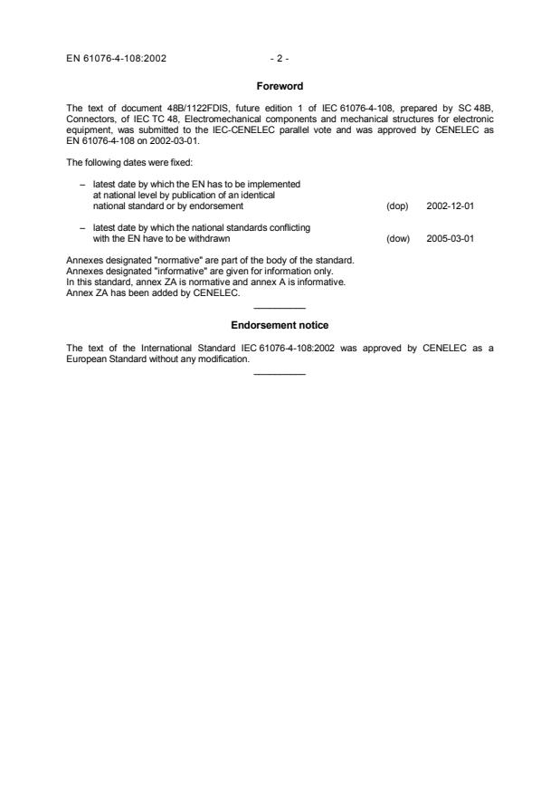 EN 61076-4-108:2002 has the following relationships with other standards: It is inter standard links to EN ISO 14272:2001, EN 61076-4-100:2001, EN 60352-2:1994/A1:1997, EN 61076-4:1996, EN 60917-1:1998, EN 60352-3:1994, EN 60068-1:1994, EN 60352-1:1997, EN 60068-2-21:1999, EN 60917-2-2:1996, EN 61076-1:1995, EN 60512-1-100:2001, EN 60352-2:1994, EN 60512-1:2001, EN 61076-4-001:1996. Understanding these relationships helps ensure you are using the most current and applicable version of the standard.