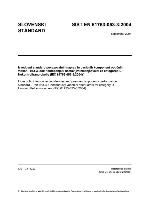Izvedbeni standard povezovalnih naprav in pasivnih komponent optičnih vlaken– 053-3. del: nestopenjski nastavljivi zmanjševalci za kategorijo U – Nekontrolirano okolje (IEC 61753-053-3:2004)*