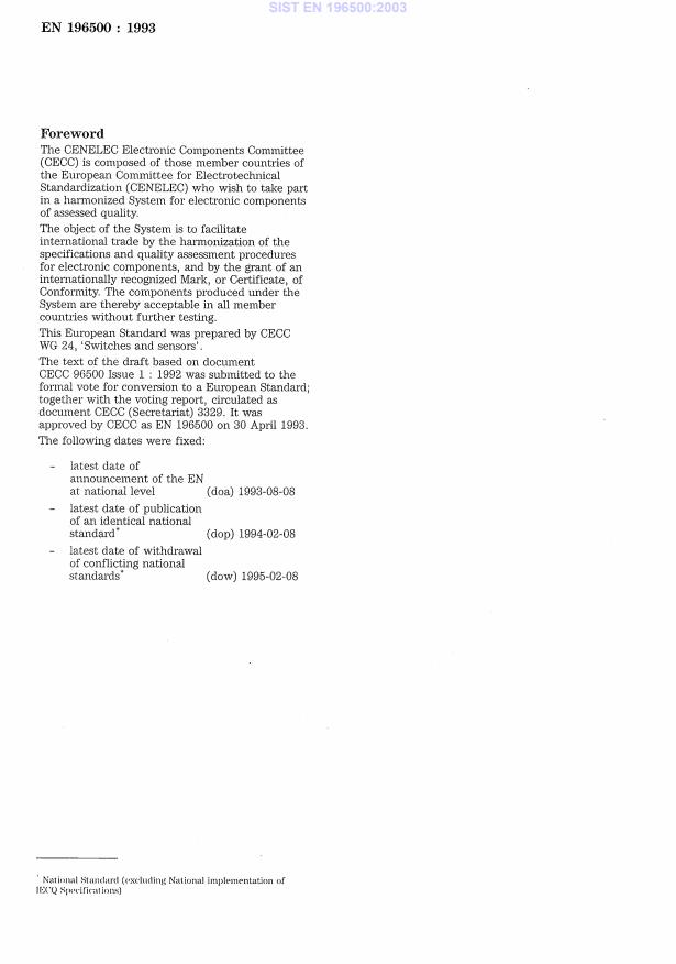 EN 196500:1993 is a standard published by CLC. Its full title is "Sectional Specification: Membrane switches including Blank Detail Specification EN 196501". This standard covers: Supersedes CECC 96 500:1992 * D96/132: CECC/SC 23JX disbanded * Superseded by EN 61020-1:2009