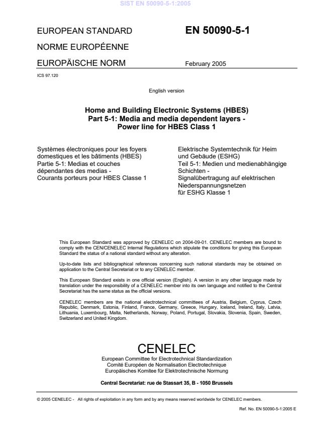 EN 50090-5-1:2005 is a standard published by CLC. Its full title is "Home and Building Electronic Systems (HBES) - Part 5-1: Media and media dependent layers - Power line for HBES Class 1". This standard covers: This European Standard defines the mandatory and optional requirements for the medium specific physical and data link layer of power line Class 1 in its two variations PL110 and PL132. Data link layer interface and general definitions, which are medium independent, are given in EN 50090 4-1.
