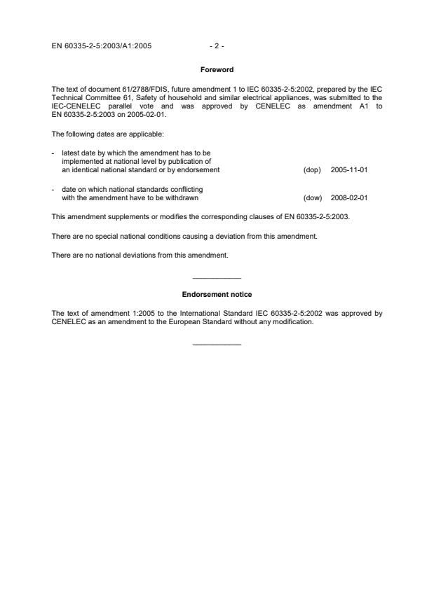 This amendment A1 modifies the European Standard EN 60335-2-5:2003; it was approved by CENELEC