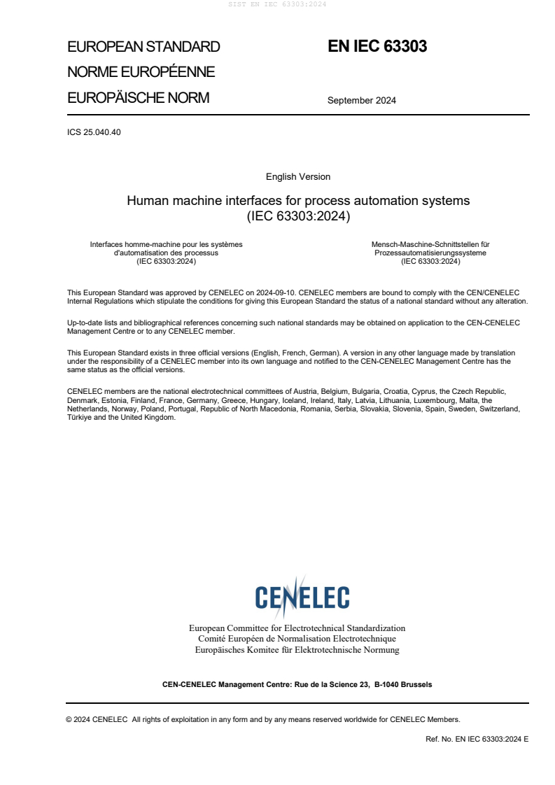 EN IEC 63303:2024 is a standard published by CLC. Its full title is "Human machine interfaces for process automation systems". This standard covers: IEC 63303:2024 defines general structures and functions of HMI systems. An HMI life cycle example for HMI systems is included. This document specifies requirements and recommendations for activities in each stage of the life cycle including designing, using, and maintaining the HMI system. It also provides requirements and recommendations for functions and performance of HMI systems. The requirements and recommendations in this document are applicable to any controlled process using an HMI to interface to a control system. There can be differences in implementation to meet the specific needs based on the application and controlled process type.