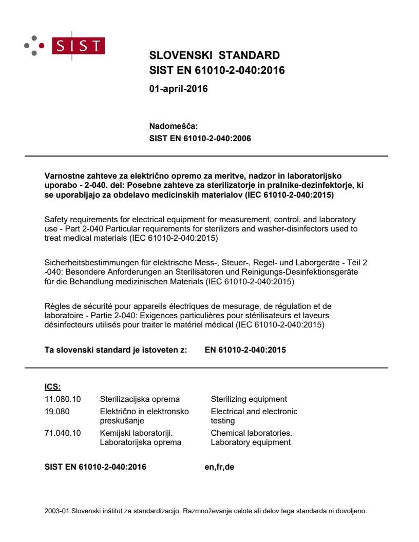 Varnostne zahteve za električno opremo za meritve, nadzor in laboratorijsko uporabo - 2-040. del: Posebne zahteve za sterilizatorje in pralnike-dezinfektorje, ki se uporabljajo za obdelavo medicinskih materialov (IEC 61010-2-040:2015)